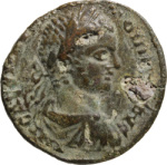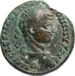 laureate, draped and cuirassed bust of Elagabalus, right, seen from rear