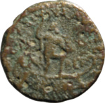 Poseidon standing, right, on galley, right, holding dolphin and resting on trident, placing foot on pedestal(?); aplustre and rower on stern