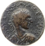 laureate, draped and cuirassed bust of Elagabalus, right, seen from rear