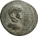 front view of temple with four columns with arcuated lintel in the middle, within which Astarte standing facing, turreted, holding long sceptre, crowned by Nike standing on small column, left, on her left; to left, Marsyas standing, right, carrying wineskin on shoulder and raising hand |