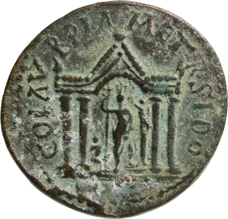 front view of temple with four columns with arcuated lintel in the middle, within which Astarte standing facing, turreted, holding long sceptre, crowned by Nike standing on small column, left, on her left; to left, Marsyas standing, right, carrying wineskin on shoulder and raising hand |