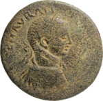 laureate bust of Elagabalus, right, wearing decorated cuirass, seen from front |