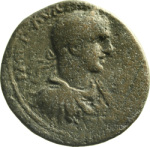 laureate, draped and cuirassed bust of Elagabalus, right, seen from front |