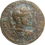 laureate, draped and cuirassed bust of Elagabalus, right, seen from rear