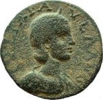 front view of temple with four columns with arcuated lintel in the middle, within which Astarte standing facing, turreted, holding long sceptre, crowned by Nike standing on small column, left, on her left; to left, Marsyas standing, right, carrying wineskin on shoulder and raising hand |