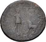 Atargatis standing facing, head right, holding sceptre; at her feet, lion seated, left; to right, small car of Astarte