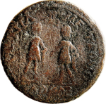 emperor standing facing in military dress, head right, holding long eagle-tipped sceptre, and male figure (Cadmus?) standing facing in chiton, head left, holding sceptre, facing each other and clasping hands |