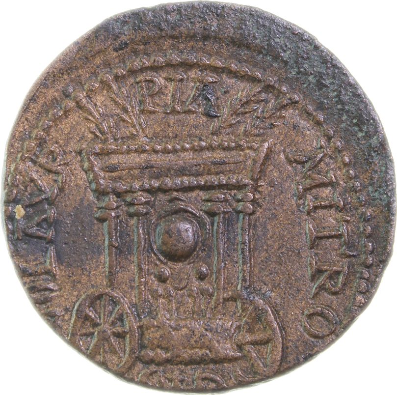 three-quarter view of two-wheel car of Astarte, right, with shrine with four columns within which baetyl on two supports; on the roof, four palm branches