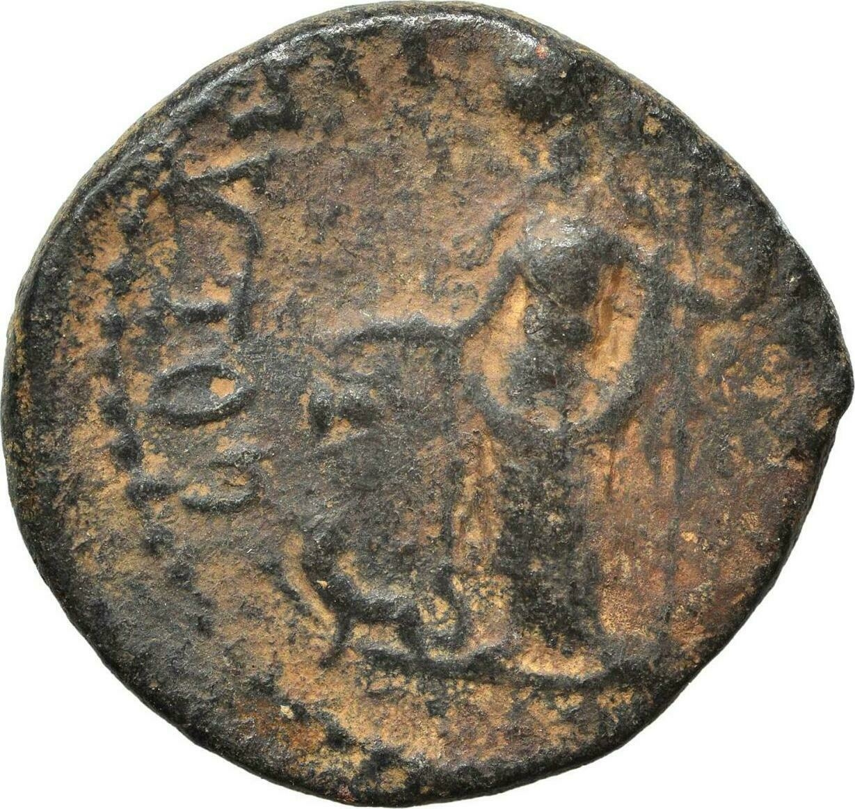 Dionysus standing facing, head left, holding long thyrsus and cantharus over panther, left, looking back; to left, car of Astarte