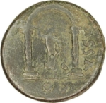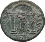 Front view of arcuated shrine with two columns, within which statue of Zeus Ammon standing, right, holding bunch of grapes; behind, serpent; before, crane