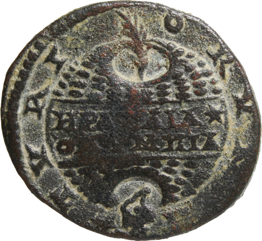 agonistic crown with palm branch, inscribed, and star; below, murex shell |