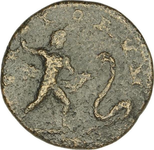 Cadmus advancing, right, wearing chlamys, throwing stone against serpent standing, left, in front of him; in the exergue, murex shell