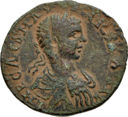laureate, draped and cuirassed bust of Elagabalus, right, seen from rear