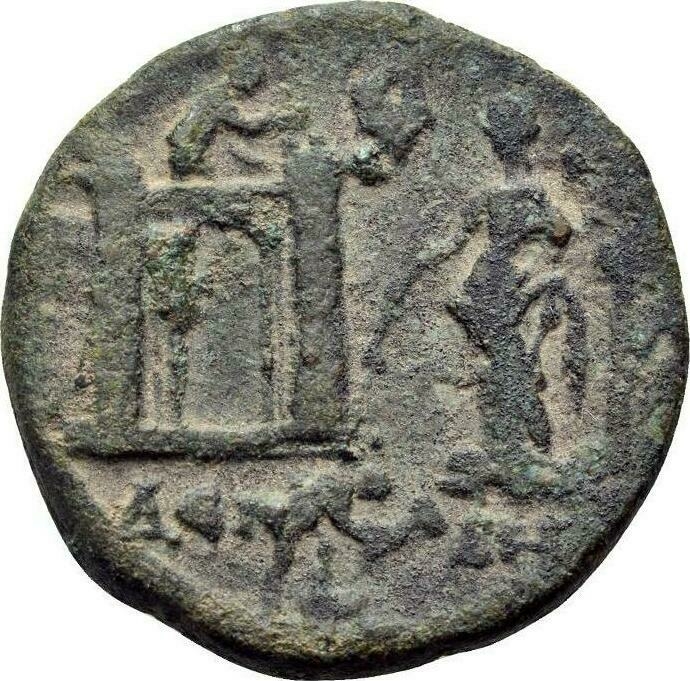 Dido standing, left, wearing peplos, holding small sceptre and torch, in front of city gate flanked by two towers; on top and below, male figure kneeling, right, building; above, murex shell; to right, small palm tree