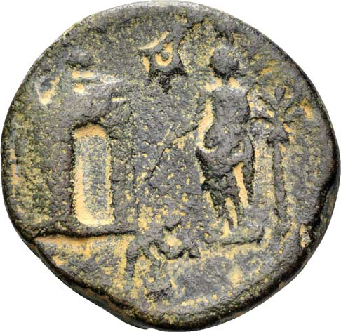 Dido standing, left, wearing peplos, holding small sceptre and torch, in front of city gate flanked by two towers; on top and below, male figure kneeling, right, building; above, murex shell; to right, small palm tree