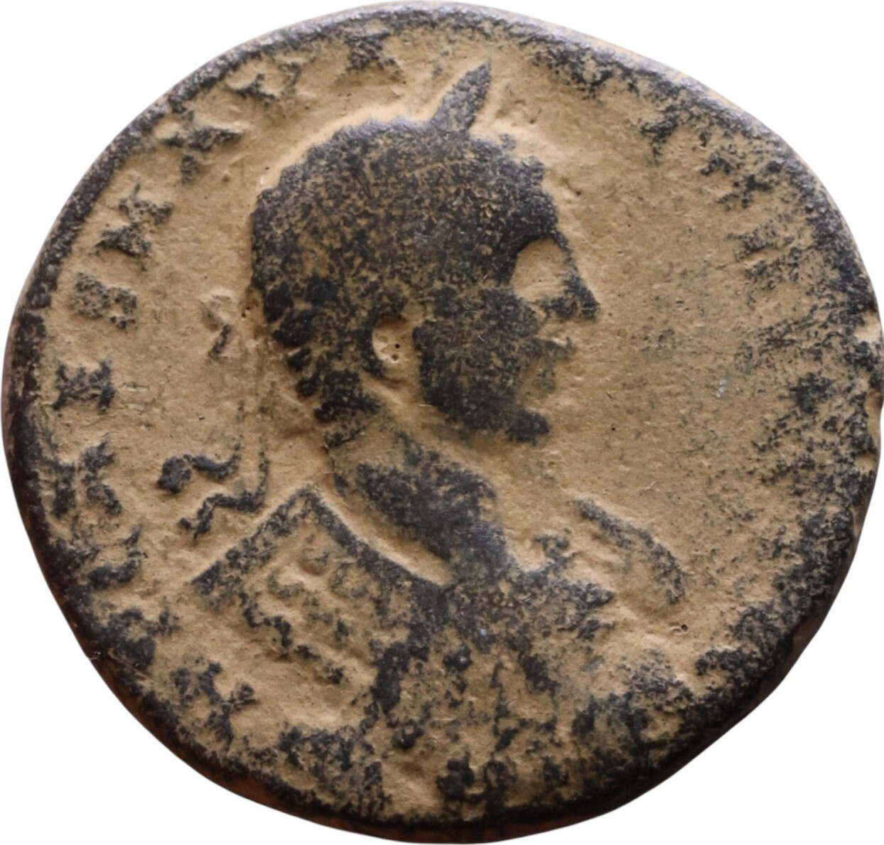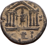 front view of temple with six columns with arcuated lintel in the middle, within which Astarte standing facing, turreted, holding long sceptre and resting on trophy on her right, crowned by Nike standing on small column, left, on her left; in exergue, altar between murex shell and small palm tree |