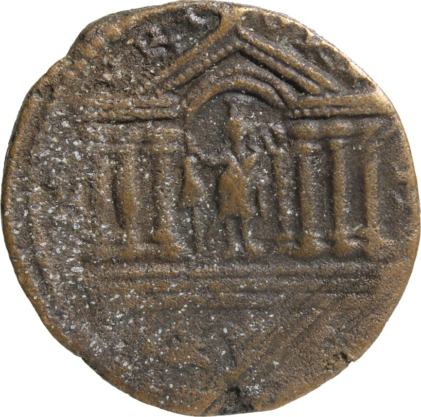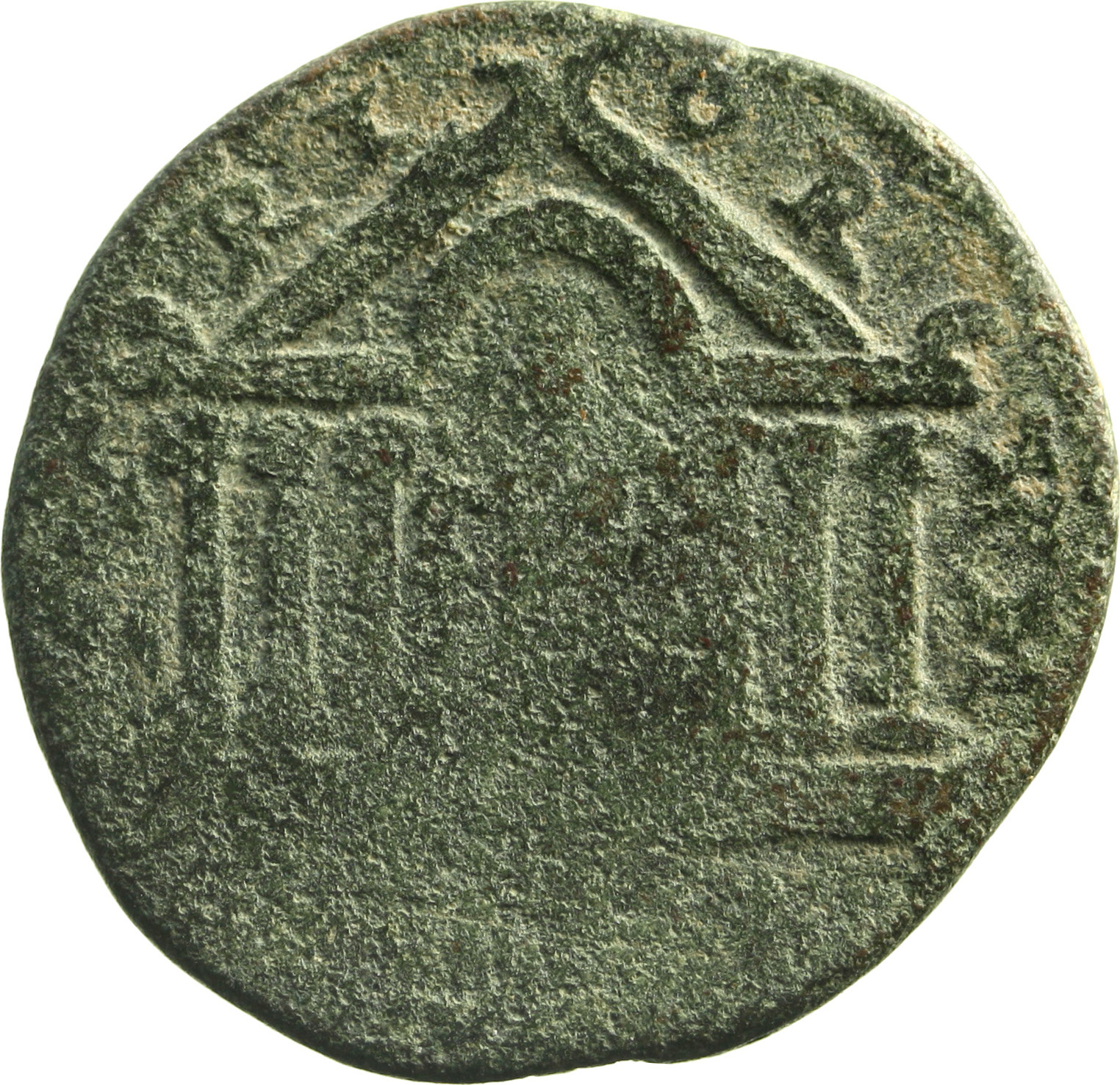 front view of temple with six columns with arcuated lintel in the middle, within which Astarte standing facing, turreted, holding long sceptre and resting on trophy on her right, crowned by Nike standing on small column, left, on her left; in exergue, altar between murex shell and small palm tree |