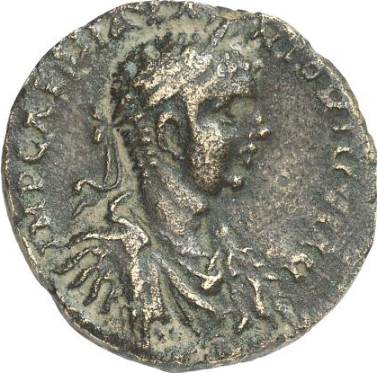 olive tree between two conical baetyl stones (Ambrosial rocks), each inscribed; in the exergue, dog, left, and murex shell |