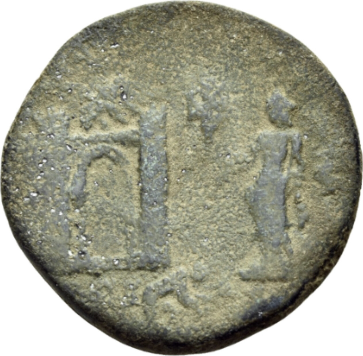 Dido standing, left, wearing peplos, holding small sceptre and torch, in front of city gate flanked by two towers; on top and below, male figure kneeling, right, building; above, murex shell; to right, small palm tree