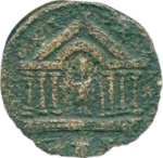 front view of temple with six columns with arcuated lintel in the middle, within which Astarte standing facing, turreted, holding long sceptre and resting on trophy on her right, crowned by Nike standing on small column, left, on her left; in exergue, altar between palm branch and murex shell |