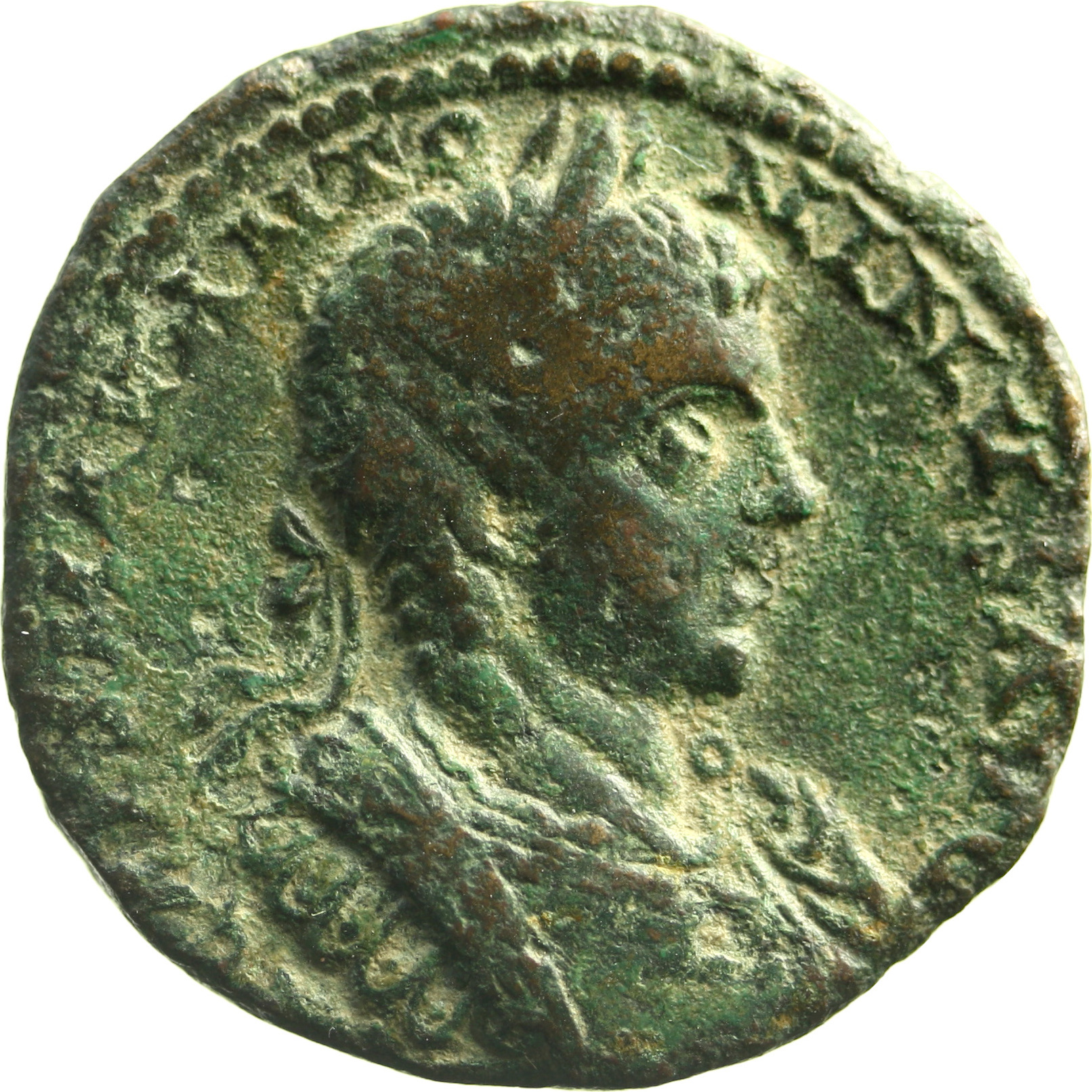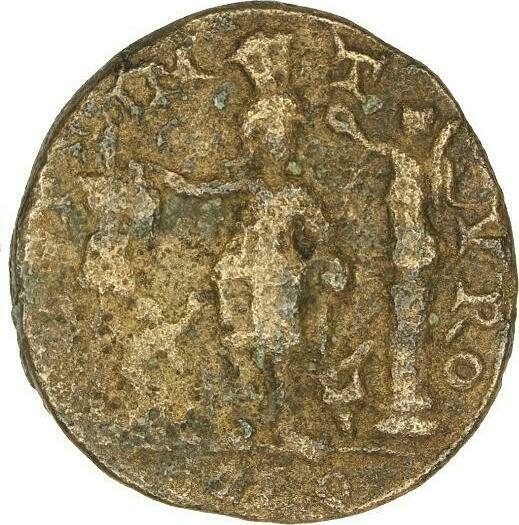 Astarte standing facing, turreted, holding long sceptre and resting on trophy on her right, crowned by Nike standing on small column, left, on her left; at her feet, to left, small Marsyas standing, right, carrying wineskin on shoulder and raising hand; to right, murex shell |