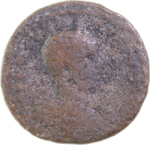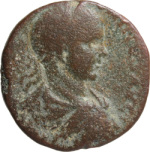 Astarte standing facing, turreted, holding long sceptre and resting on trophy on her right, crowned by Nike standing on small column, left, on her left; at her feet, to left, small Marsyas standing, right, carrying wineskin on shoulder and raising hand; to right, murex shell |