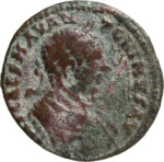 Astarte standing facing, turreted, holding long sceptre and resting on trophy on her right, crowned by Nike standing on small column, left, on her left; at her feet, to left, small Marsyas standing, right, carrying wineskin on shoulder and raising hand; to right, murex shell |