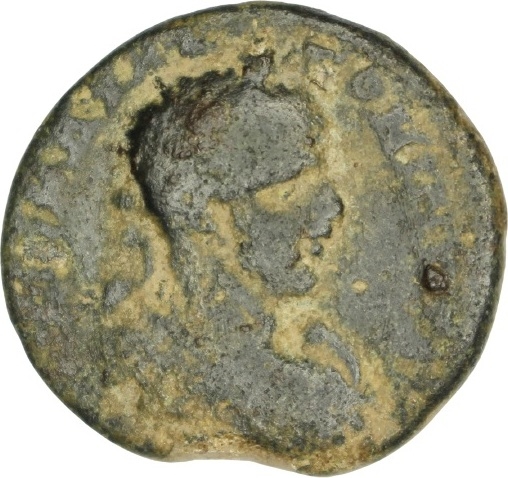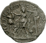 Astarte standing facing, turreted, holding long sceptre and resting on trophy on her right, crowned by Nike standing on small column, left, on her left; at her feet, to left, small Marsyas standing, right, carrying wineskin on shoulder and raising hand; to right, murex shell |