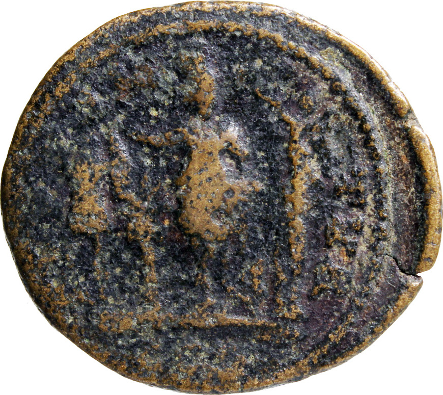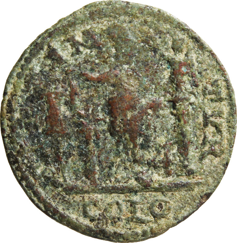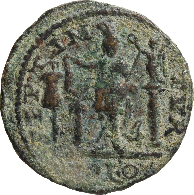Astarte standing facing, turreted, holding long sceptre and resting on trophy on her right, crowned by Nike standing on small column, left, on her left; at her feet, to left, small palm tree; to right, murex shell