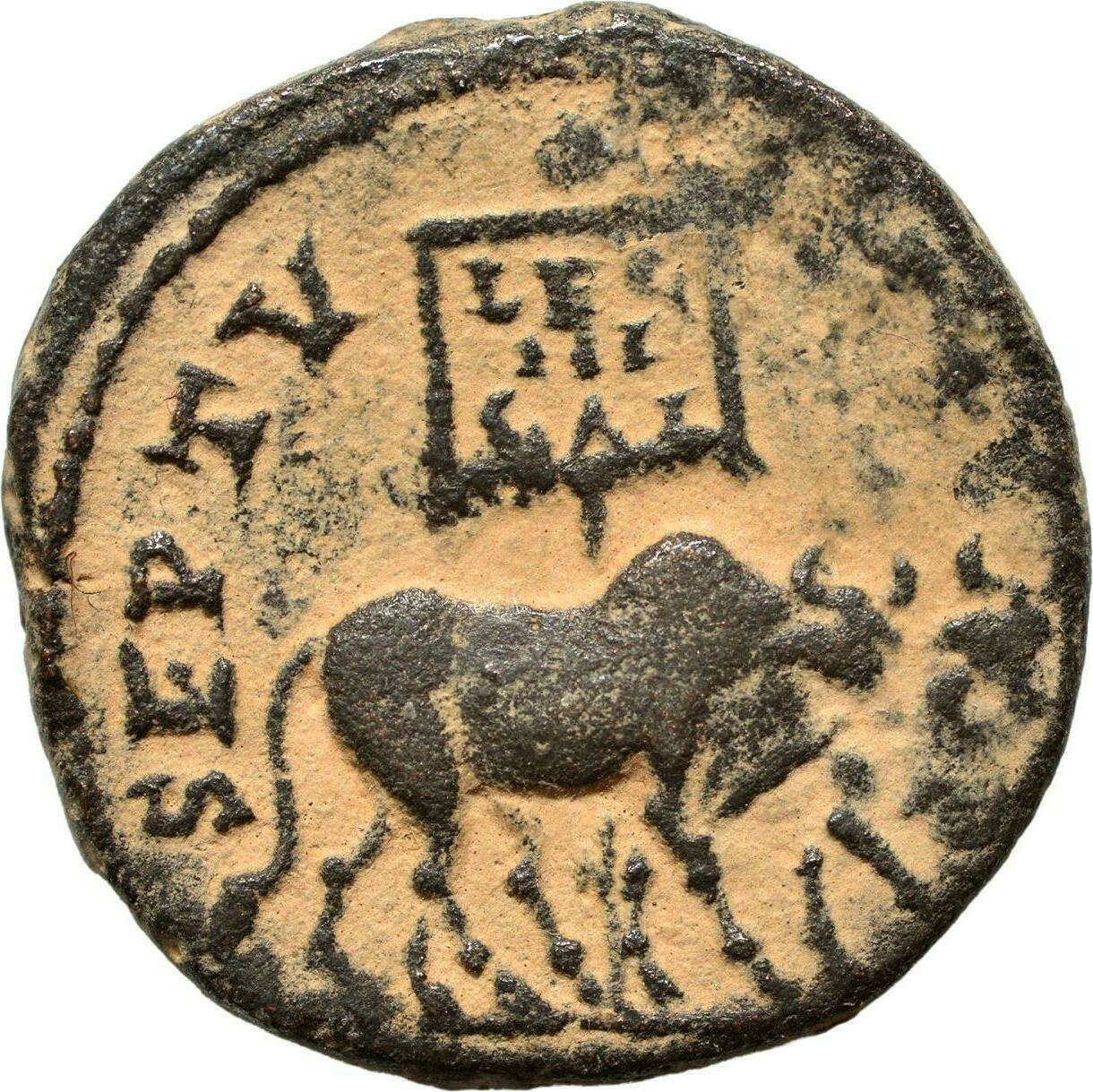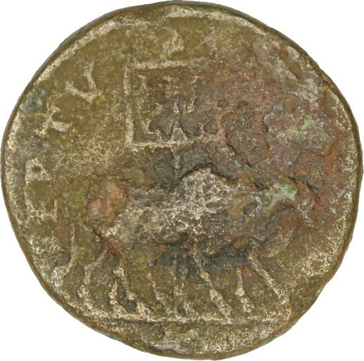 two oxen advancing, right; in the background, inscribed standard; in the exergue, murex shell |