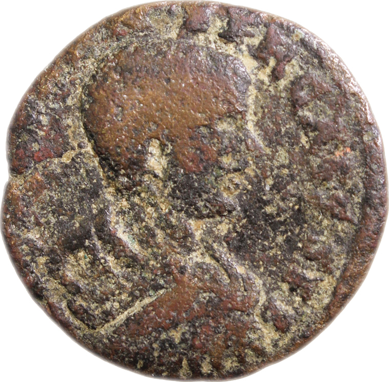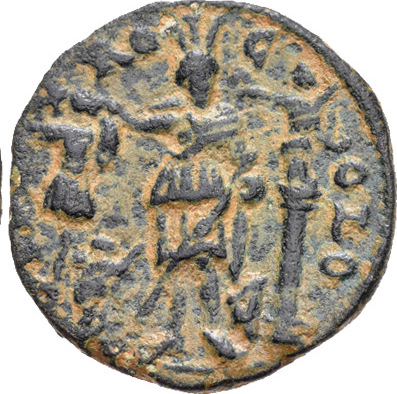 Astarte standing facing, turreted, holding long sceptre and resting on trophy on her right, crowned by Nike standing on small column, left, on her left; at her feet, to left, small Marsyas standing, right, carrying wineskin on shoulder and raising hand; to right, murex shell |
