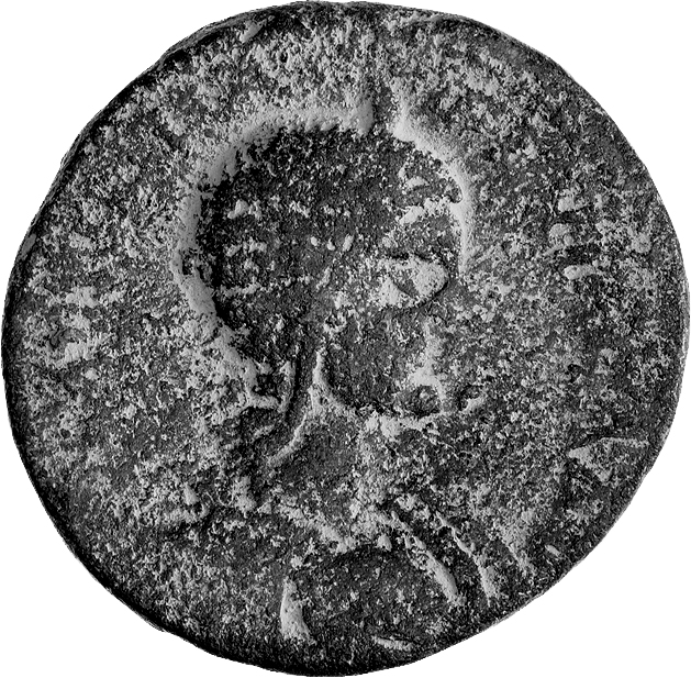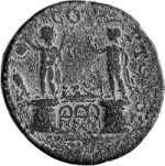 two male figures (the Dioscuri?) standing facing on bases, looking at each other, each wearing cap, raising hand and holding sword(?), on either pillar of a bridge with three arches; to left, club, to right, caduceus