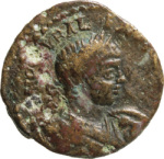 laureate, draped and cuirassed bust of Severus Alexander, right, holding shield and spear on his shoulder, seen from front |