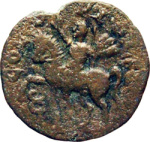 the Emperor in military dress on horseback advancing, left, holding sceptre and saluting; under the horse's foreleg, caduceus