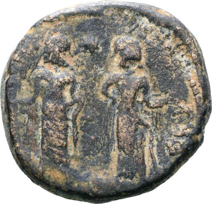 Asclepius standing facing, head right, holding serpent-staff, and Hygieia standing facing, head left, feeding serpent from patera |