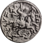 emperor on horse prancing, right, wearing chlamys and about to spear fallen enemy below
