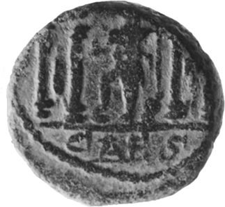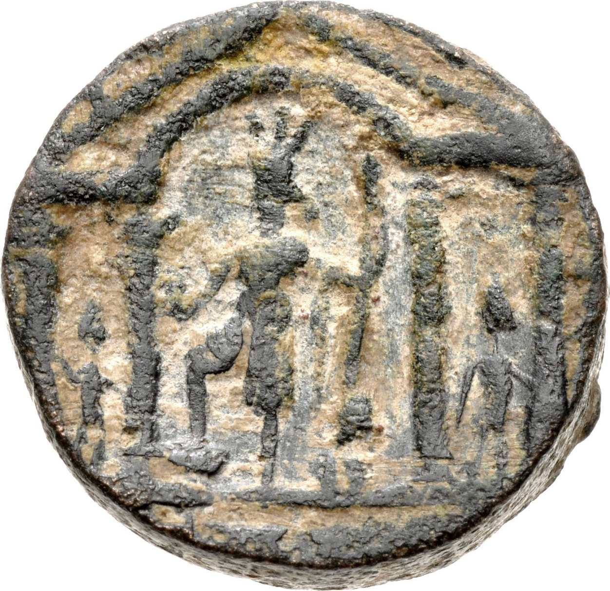 front view of temple with four columns with arcuated lintel in the middle of pediment, within which Tyche standing facing turreted, head left, holding small bust and spear and placing foot on globe(?); in each aisle, statue standing