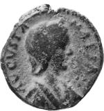 front view of temple with four columns, wreath in pediment, within which Jupiter seated on throne, facing, holding long sceptre, between Minerva, to left, standing facing, head right, resting on shield, and Juno, to right, standing facing, head left |