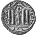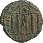 front view of temple with four columns with arcuated lintel in the middle of pediment, within which Tyche standing, facing, head left, wearing kalathos, holding small bust and spear and placing foot on globe(?)