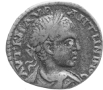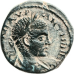 front view of temple with four columns with arcuated lintel in the middle of pediment, within which Tyche standing, facing, head left, wearing kalathos, holding small bust and spear and placing foot on globe(?); in each aisle, figure standing facing, upon which wreath hanging from the ceiling |