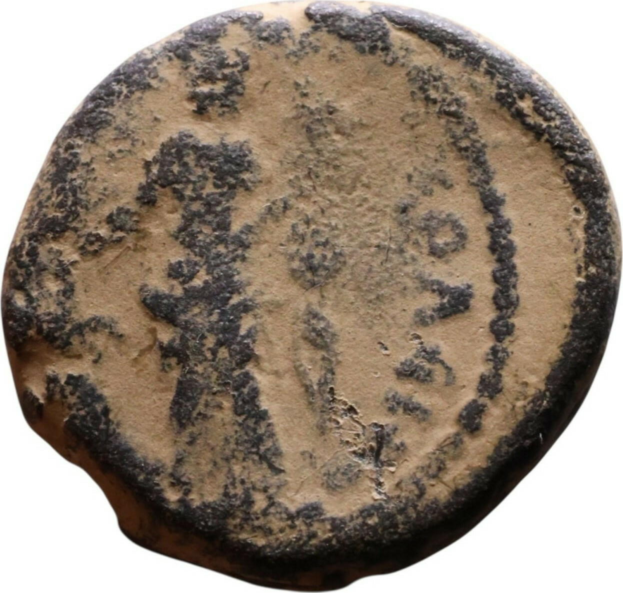 Tyche standing facing, head left, wearing kalathos, holding cornucopia and rudder; to left, letter or symbol