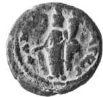 Tyche standing facing, head left, wearing kalathos, holding cornucopia and rudder
