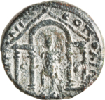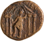 front view of temple with four columns with arcuated lintel, within which Tyche standing facing turreted, head left, holding sceptre and small bust, placing foot on prow