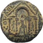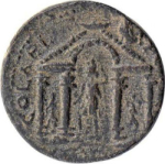 Reverse design front view of temple with four columns with arcuated lintel in the middle of pediment, within which Tyche standing facing turreted, head left, holding small bust and spear and placing foot on globe(?); in each aisle, Nike standing on globe and offering wreath to her