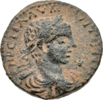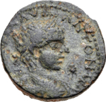 front view of temple with four columns with arcuated lintel in the middle of pediment, within which Tyche standing facing turreted, head left, holding small bust and spear and placing foot on globe(?); in each aisle, Nike standing on globe and offering wreath to her |