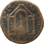 front view of temple with four columns with arcuated lintel in the middle of pediment, within which Tyche standing facing turreted, head left, holding small bust and spear and placing foot on globe(?); in each aisle, Nike standing on globe and offering wreath to her |