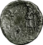 Tyche standing facing turreted, head left, holding small bust and sceptre and placing foot on globe(?), before altar; to left, aquila; above, star