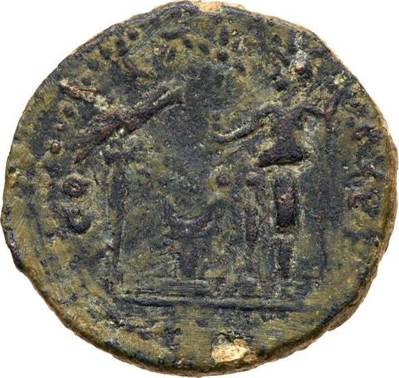 Tyche standing facing turreted, head left, holding small bust and sceptre and placing foot on globe(?), before altar; to left, aquila; above, star; in the exergue, wine cup