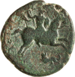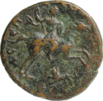 the Emperor on horse galloping, right, wearing chlamys and spearing lion(?) below, left |