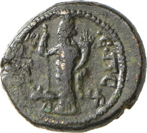 Tyche of the City standing facing turreted, head left, holding cornucopia and long sceptre; behind, heifer, left; to right, 𐤌